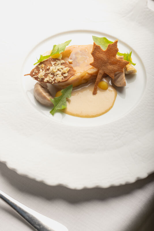 Nella cornice storica di Palazzo Portinari Salviati, il ristorante ATTO di Vito Mollica interpreta la tradizione toscana della galantina attraverso un piatto di grande eleganza. La terrina di fagianella prende ispirazione dalle preparazioni classiche di cacciagione, valorizzando una materia prima delicata e poco comune. La cottura lenta nel brodo della stessa fagianella, a temperatura controllata, garantisce una consistenza morbida e precisa. La dolcezza delle castagne e la nota fresca e acidula del mandarino costruiscono un equilibrio armonico, pensato per dialogare con bollicine e vini selezionati dalla sommelier Clizia Zuin. Un piatto stagionale, presente nel menu degustazione durante i mesi della cacciagione.